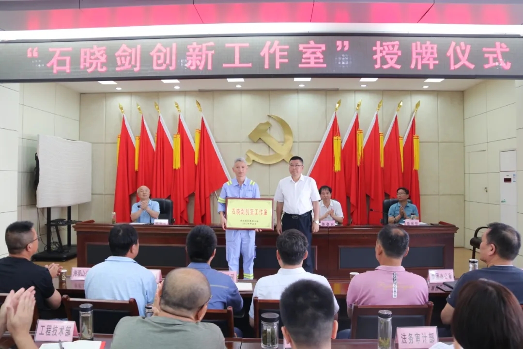 三樓會議室座無虛席,公司領(lǐng)導班子,機關(guān)部室負責人、基層單位分管領(lǐng)導及技術(shù)骨干、職工代表等40余人共同見證授牌時刻。湖北省首席工人技師、公司首席電氣工程師石曉劍進行表態(tài)發(fā)言,公司黨委書記、董事長、總經(jīng)理余曦親自將“石曉劍創(chuàng)新工作室”銅牌頒授到石曉劍手上。